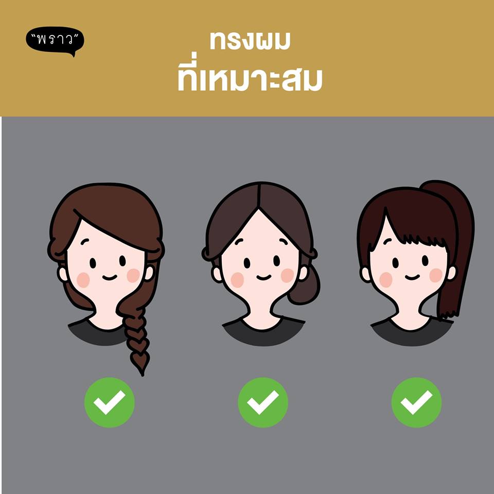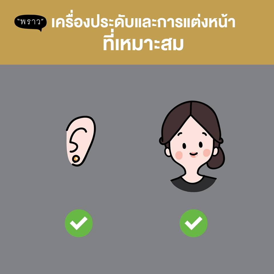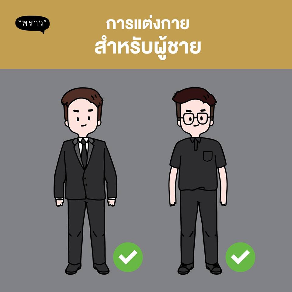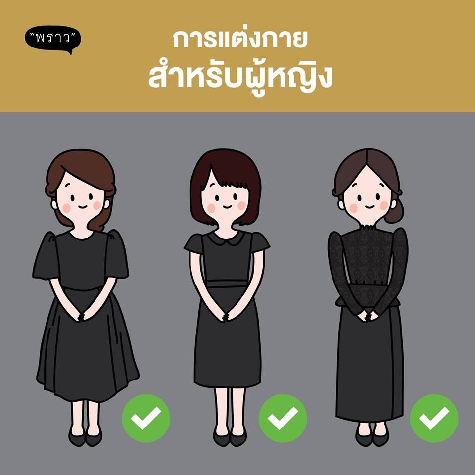 - สุภาพสตรี สวมเสื้อดำเรียบๆ ไม่มีลวดลาย ไม่รัดรูป ห้ามเสื้อแขนกุด หรือสายเดี่ยว สวมกระโปรงดำคลุมเข่า