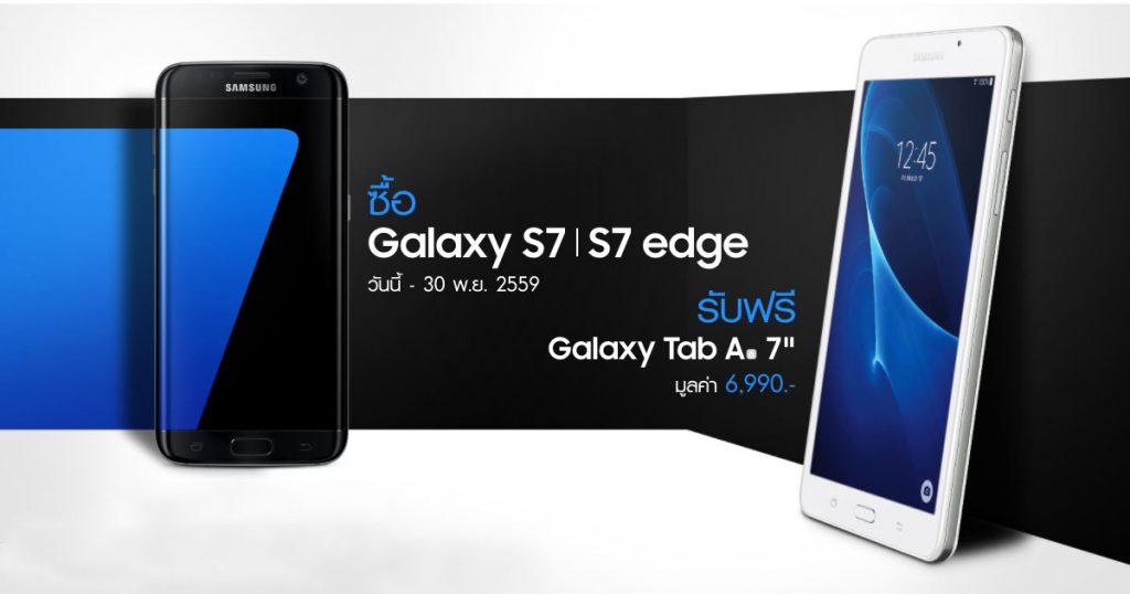 โปรโมชั่นสุดแรงของทาง Samsung กับสมาร์ทโฟน Galaxy S7 และ S7 edge ซื้อปั๊บรับฟรีทันที Galaxy Tab A (2016) รุ่น 7 นิ้ว มูลค่า 6,990 บาทไปเลยฟรี จากเดิมโปรฯ สิ้นสุดแค่ปลายเดือนตุลาคม ตอนนี้ Samsung ขยายเวลาให้จนถึง 30 พฤศจิกายนนี้