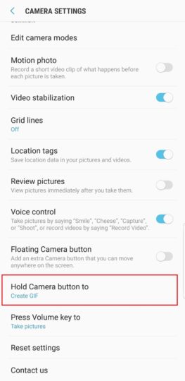 อย่างที่ทราบกันดีว่าในสมาร์ทโฟนเรือธงรุ่นก่อนๆ การกดปุ่มชัตเตอร์ค้างไว้นานๆ จะเป็นการถ่ายภาพแบบ Brust Shot ซึ่งภาพที่ได้ก็จะมีจำนวนหลายภาพแต่เราสามารถเลือกช็อตที่ดีที่สุดเพียงรูปเดียวได้ แต่ใน S9 เราสามารถเปลี่ยนปุ่มชั๊ตเตอร์ให้เรียกฟังก์ชั่นสร้างไฟล์ GIF แทนได้ โดยสามารถเข้าไปตั้งค่าได้ตาม S9 Tips ดังนี้