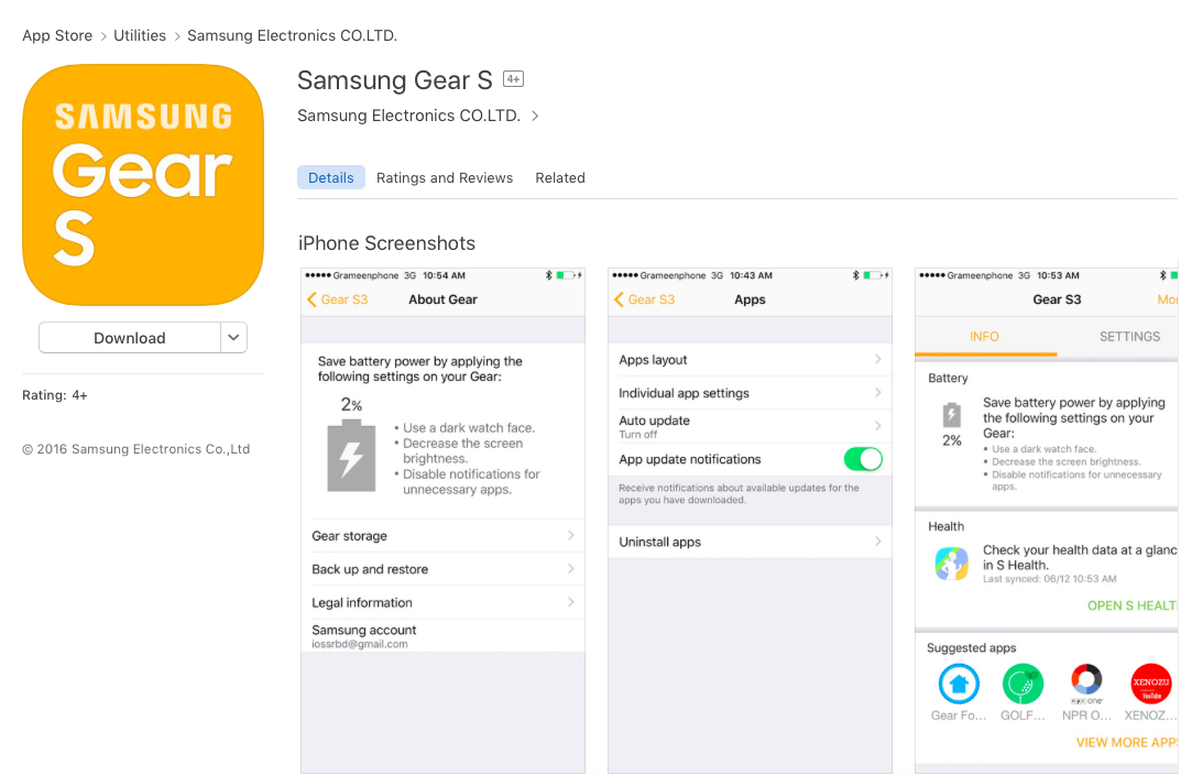 โดยที่ตัวแอพพลิเคชั่นบน iOS นั้นจะแยกออกเป็น 2 ตัวด้วยกันคือ Samsung Gear Sสำหรับใช้กับ Gear S2 และ Gear S3 ส่วนอีกแอพคือ Samsung Gear Fit สำหรับใช้กับ Gear Fit2 โดยเมื่อดาวน์โหลดลงมาติดตั้งใน iPhone, iPad ที่เป็น iOS 9.0 ขึ้นไป ก็จะทำการเชื่อมต่อโดยเปิด Bluetooth ที่เครื่อง ตัวแอพจะทำการค้นหาและจับคู่กับอุปกรณ์ของเราผ่านทางแอพได้เลย