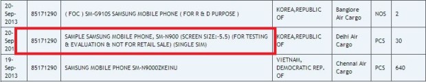 แม้ว่า Galaxy Note 3 ใกล้วางจำหน่ายอย่างเป็นทางการแล้ว (ในไทยเริ่มส่งมอบ 25 กันยายน) แต่ข่าวลือของ Note 3 รุ่นลดสเปคยังมีออกมาอยู่ จากข้อมูล Shipment ในเว็บ Zauba ในอินเดีย มีรายการ SM-N900 หน้าจอ 5.5 นิ้ว ซึ่งคาดว่าจะเป็น Note 3 ราคาประหยัดนั่นเอง ทั้งนี้ Device ทั้งหมดถูกส่งมาเพื่อทดสอบเป็นการภายในครับ