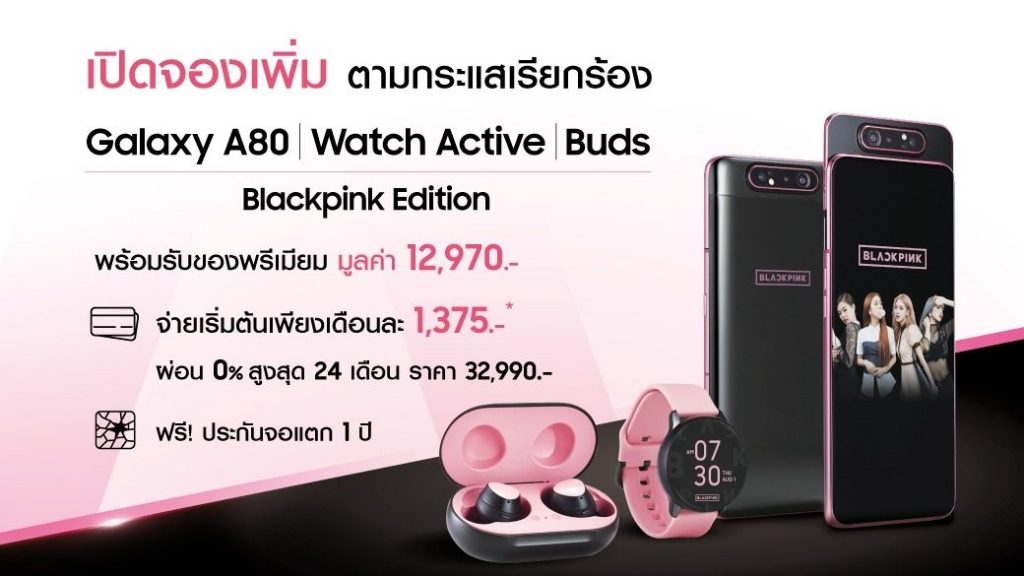ยังไม่หมดเพียงเท่านี้! ซัมซุง กาแลคซี่ เอ 80 มาพร้อมการรับประกันหน้าจอนาน 1 ปี ในกรณีตก แตก หรือร้าว มูลค่าสูงสุด 3,500 บาท รับสิทธิ์ง่าย ๆ โดยลงทะเบียนผ่านแอปพลิเคชั่น Galaxy Gift ตามเงื่อนไขที่กำหนด Galaxy A80Blackpink Edition เปิดให้จองในราคาพิเศษ 32,990 บาท สามารถผ่อนชำระ 0% ได้นานสูงสุดถึง 24 เดือน สามารถจองได้ตั้งแต่วันที่ 19 – 21 กรกฎาคม 2562 นี้ ที่ซัมซุงออนไลน์ช็อป www.samsung.com/th/galaxy-a80-special และSamsung Brandshop ที่ร่วมรายการ