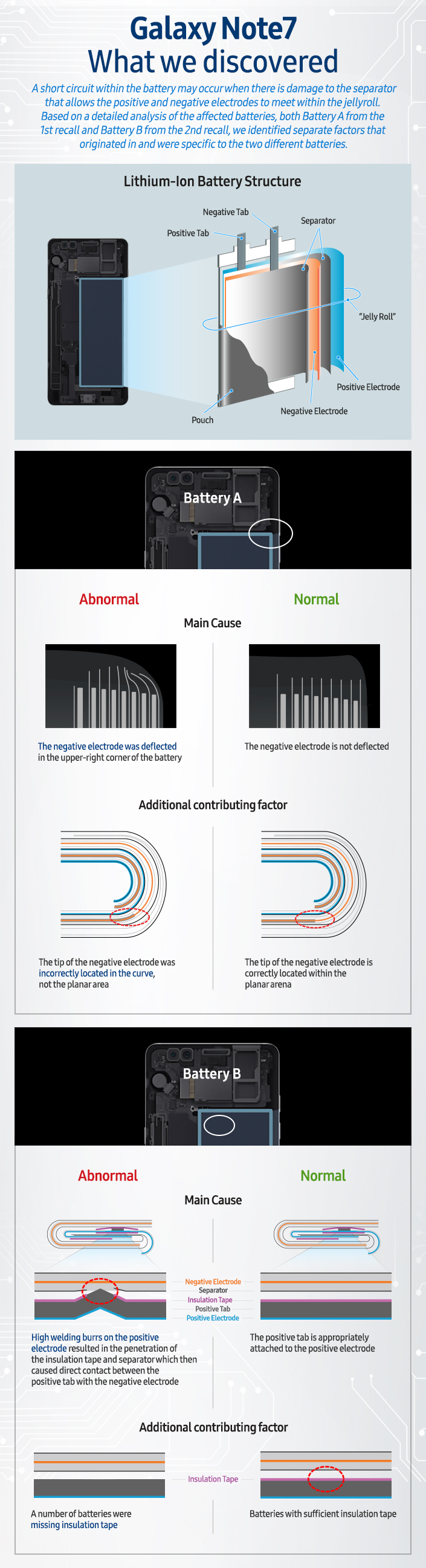 ในการทดสอบของ Samsung ได้ดำเนินการกับแบตเตอรี่ที่มีทั้งหมด 2 ล็อตด้วยกันคือ Battery A (ชุดแรกที่เริ่มวางจำหน่ายแล้วเกิดปัญหา) และ Battery B (ชุดที่เปลี่ยนให้กับเครื่องที่มีปัญหาหลังจากส่งกลับมา) โดยปัญหาที่พบในล็อตของ Battery A เกิดจากแบตเตอรี่เมื่อประกอบเข้าในเครื่องถูกแรงกดจนทำให้บริเวณมุมขวาบนของแบตเตอรี่มีการบิดงอ ส่งผลให้ขั้วของแบตเตอรี่ภายในสัมผัสกันจนเกิดการลัดวงจร และลุกไหม้