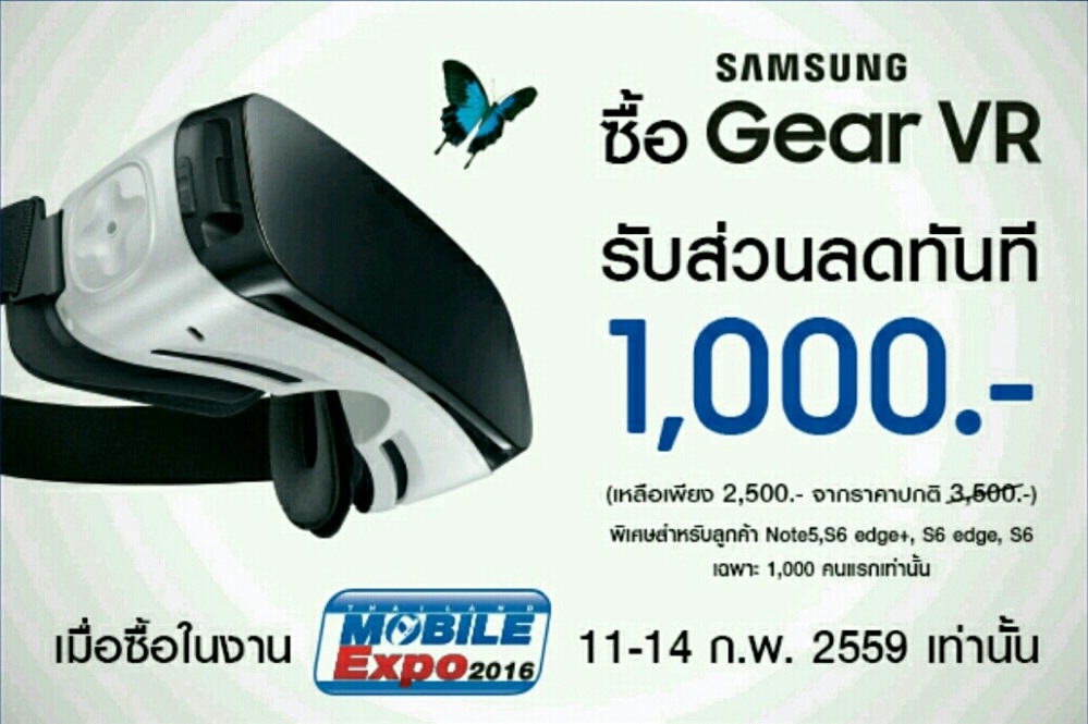 ในงานมหกรรมสมาร์ทโฟน Mobile Expo 2016 หรือ Thailand Mobile Expo 2016 ที่กำลังจะมาถึงนี้ ทางซัมซุงได้ให้สิทธิ์แก่ผู้ใช้ Galaxy S6, Galaxy S6 Edge, Galaxy S6 Edge Plus, Galaxy Note 5 ในการซื้อ Samsung Gear VR จากราคา 3,500 บาท เหลือเพียง 2,500 บาท ครับ ลดไปตั้ง 1,000 บาทเลยทีเดียว โดยจำกัดสิทธิเฉพาะ 1,000 ท่านแรก และจะต้องเป็นผู้ที่ใช้ สมาร์ทโฟนทั้ง 4 รุ่นดังกล่าวเท่านั้นจึงจะสามารถรับสิทธิ์ผ่าน Galaxy Gift แล้วเอาไปรับคูปองแลกซื้อที่งาน