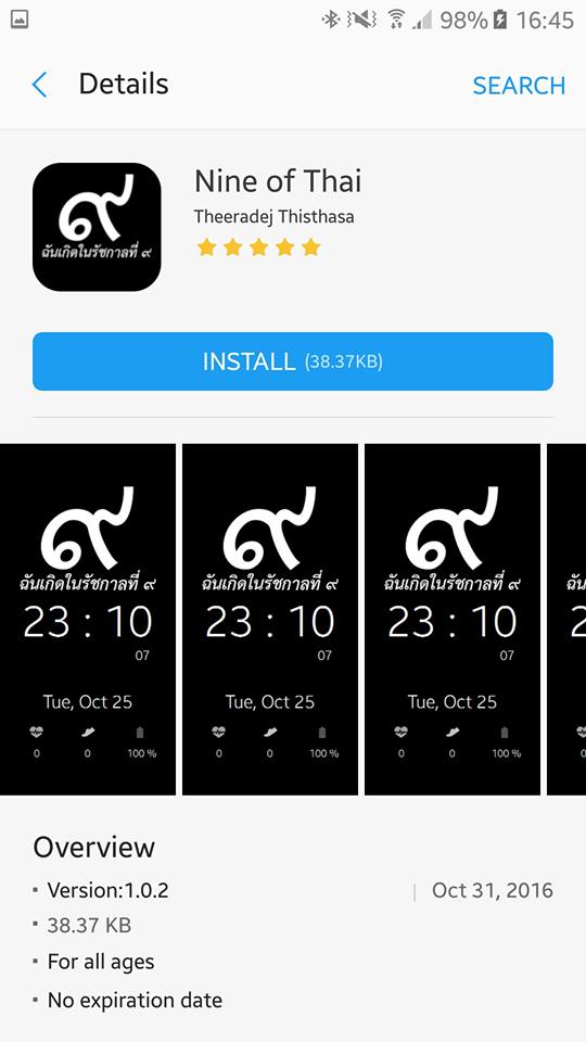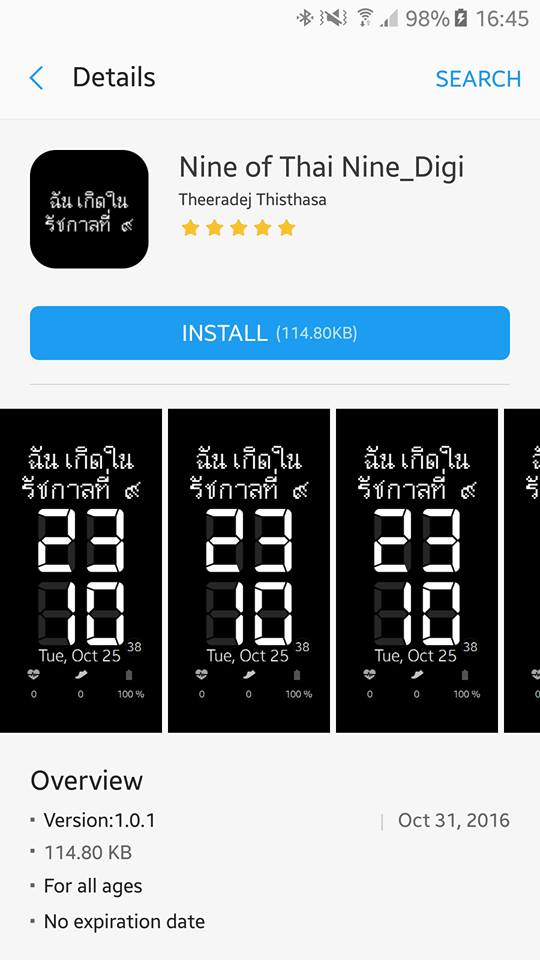 ผู้ที่ใช้งานนาฬิกา Samsung Gear S2 และ Samsung Gear Fit2 ตอนนี้มีคนทำหน้าปัด Watchface “ฉันเกิดในรัชกาลที่๙” เพื่อแสดงความอาลัย ให้ดาวน์โหลดมาเปลี่ยนบนหน้าปัดกันได้แล้ว